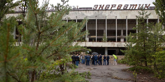 Ukrainian President Volodymyr Zelenskiy and other officials visit the abandoned city of Prypyat some 3 kilometers (1.86 miles) from Chernobyl in Prypyat , Ukraine, Wednesday, July 10, 2019. A structure built to confine radioactive dust from the nuclear reactor at the center of the 1986 Chernobyl disaster was formally unveiled on Wednesday.(Ukrainian Presidential Press Office via AP)