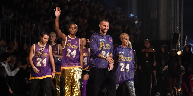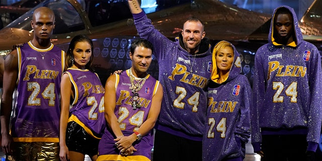 During the event’s finale, models walked out in bedazzled basketball jerseys evidently inspired by the Los Angeles Lakers, featuring Bryant’s number, 24, with Plein’s name replacing that of the NBA great and the Lakers logo. Celebrities Jada Pinkett Smith and Olivia Culpo joined the designer on stage, wearing the duds for the show’s conclusion.
