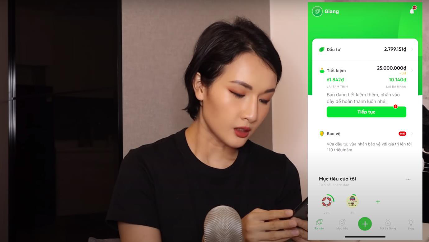 Giang chia sẻ: "Trước đây ngay khi mình nhận tiền mình sẽ dùng ngân hàng trực tuyến để lập một tài khoản tiết kiệm luôn. Nhưng gần đây, mỗi khi mình nhận tiền thì mình sẽ gửi vào Finhay bởi vì lãi suất cao hơn và mình rút tiền ra lúc nào cũng được chứ mình không bị giam tiền ở đó và mình không bị mất lãi khi mình rút sớm. Đây là một app mình dùng để tiết kiệm và đầu tư".