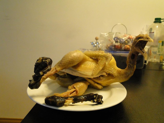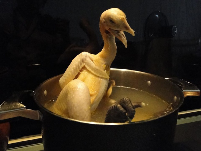 Một trong những tác phẩm ấn tượng nhất tính đến thời điểm hiện tại: gà cắp nách. Theo chia sẻ của tác giả thì vì gà to mà nồi nhỏ nên đã "cái khó ló cái khôn" ra thế này.