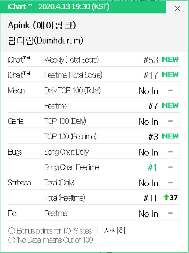 Đến 20 giờ (giờ địa phương), "Dumhdurum" tăng 2 bậc trên Melon để tiến vào top 5. Kể từ đầu 2020 đến này, trước đó chỉ có duy nhất IZ*ONE là nhóm nữ làm được điều này. Trên Genie, ca khúc cũng tăng 2 bậc để đạt no.1, giúp Apink là nhóm thứ 5 có bài hát đạt #1 sau BTS, ITZY, (G)I-DLE và WINNER trong năm nay.